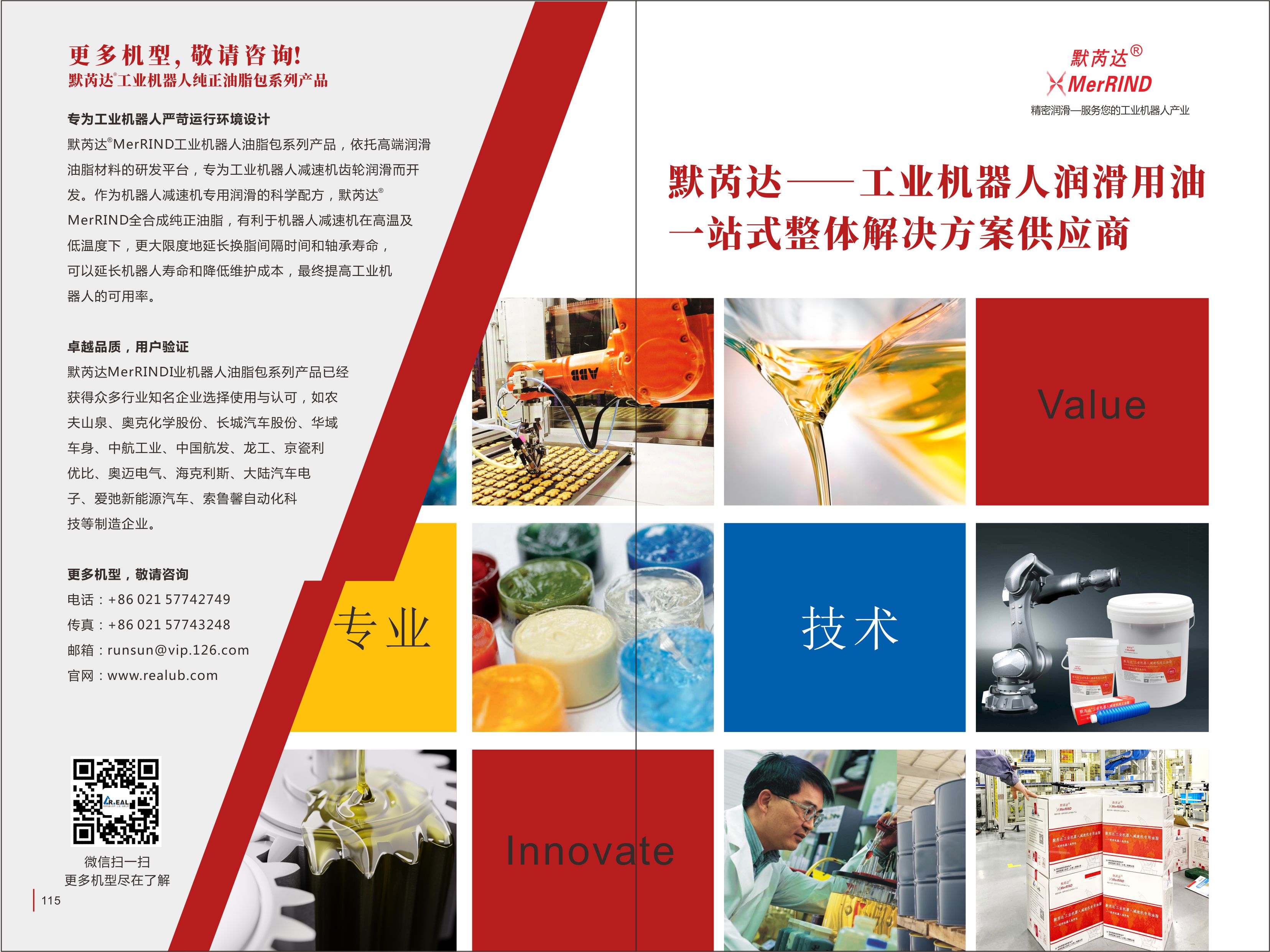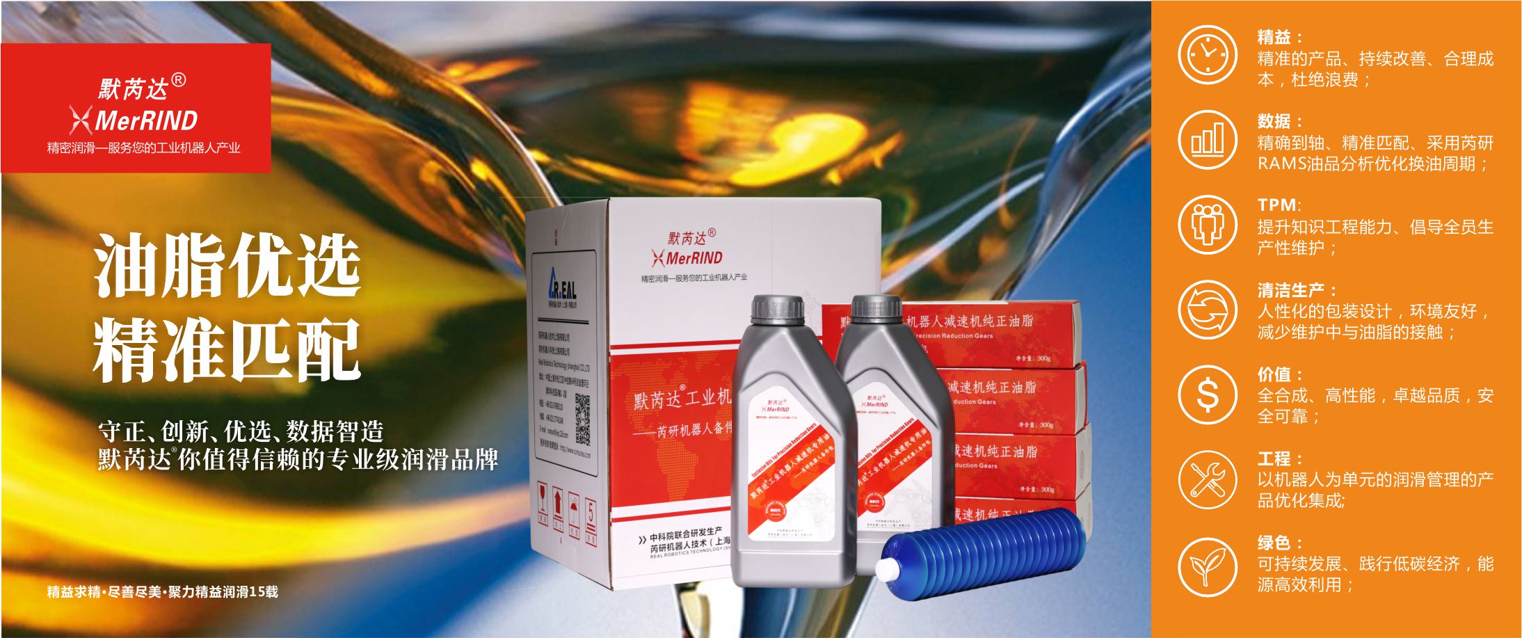 默芮达® MerRIND 工业机器人油脂包系列产品,依托高端润滑油脂材料的研发平台,专为工业机器人减速机齿轮润滑而开发。产品选用合成基础油和性能优异的添加剂经过精心配方而成,是有着高承载力、高级微点蚀保护、良好的过滤性能、良好的轴承润滑性、长寿命性能的润滑剂。